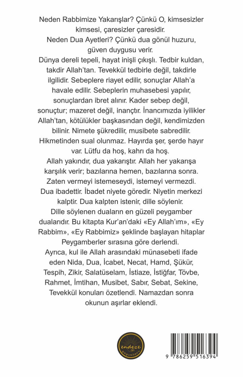 Dille söylenen duaların en güzeli peygamber dualarıdır. Bu kitapta Kur’an’daki «Ey Allah’ım», «Ey Rabbim», «Ey Rabbimiz» şeklinde başlayan hitaplar Peygamberler sırasına göre derlendi.